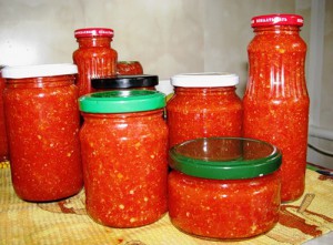2.5 кг помидор, 500 г моркови, 500 г сладкого перца, 2 стручка горького перца, 250-300 г чеснока, 500 г лука, 500 г яблок или груш. Все пропустить через мясорубку, добавить 250 г сахара, 100 г. соли, 250 г растительного российского масла и варить на медленном огне 2 часа с открытой на половину крышкой. Горячую массу разложить по банкам или бутылочкам и закатать. | |